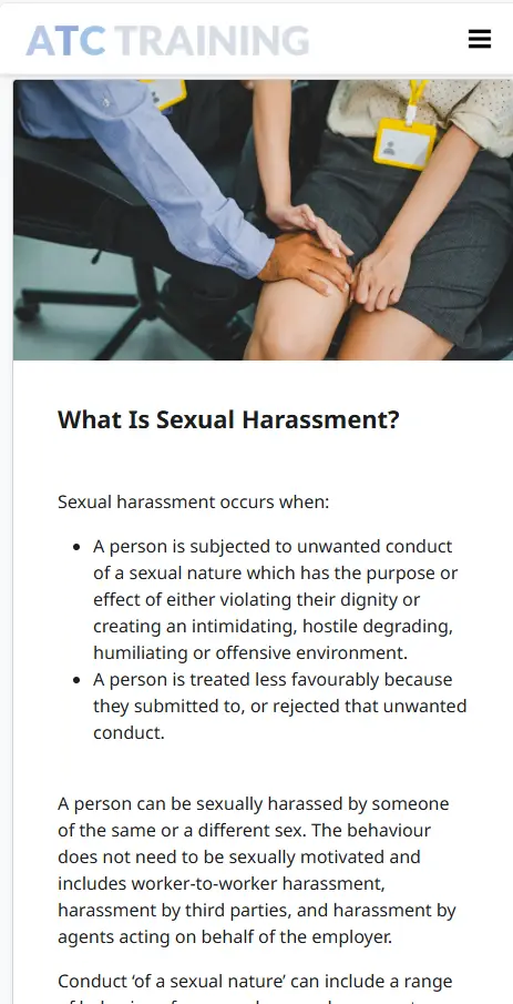 This short course can form part of the employer’s strategy to raise awareness and reduce the risk of occurrence. Trainees will review examples of sexual harassment in the workplace and know how to respond accordingly.